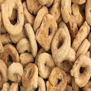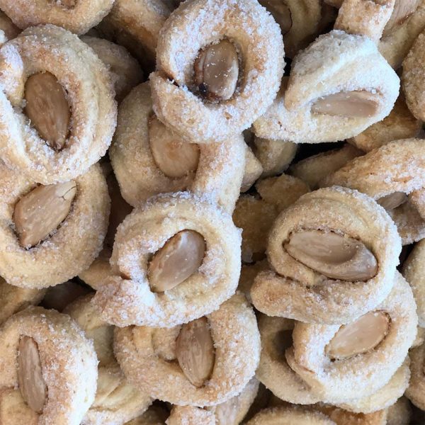 Ingredienti: farina di grano tenero “00”, olio di semi di girasole alto-oleico, vino bianco (contiene solfiti), zucchero, olio di oliva, sale, lievito, vanillina, mandorle (30%), uova, concentrato arancia.