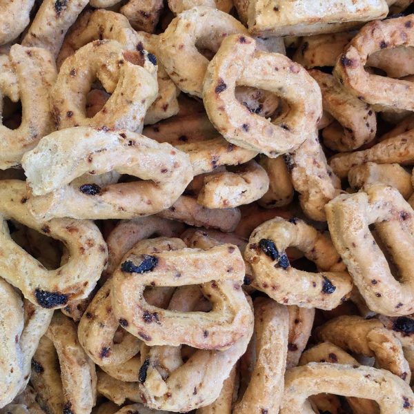 Ingredienti: farina di grano tenero “0”, vino bianco (contiene solfiti), olio di girasole (alto-oleico), olio di oliva, olio di sansa di oliva, sale iodato, uva sultanina (7%), cipolla granulare (4%).